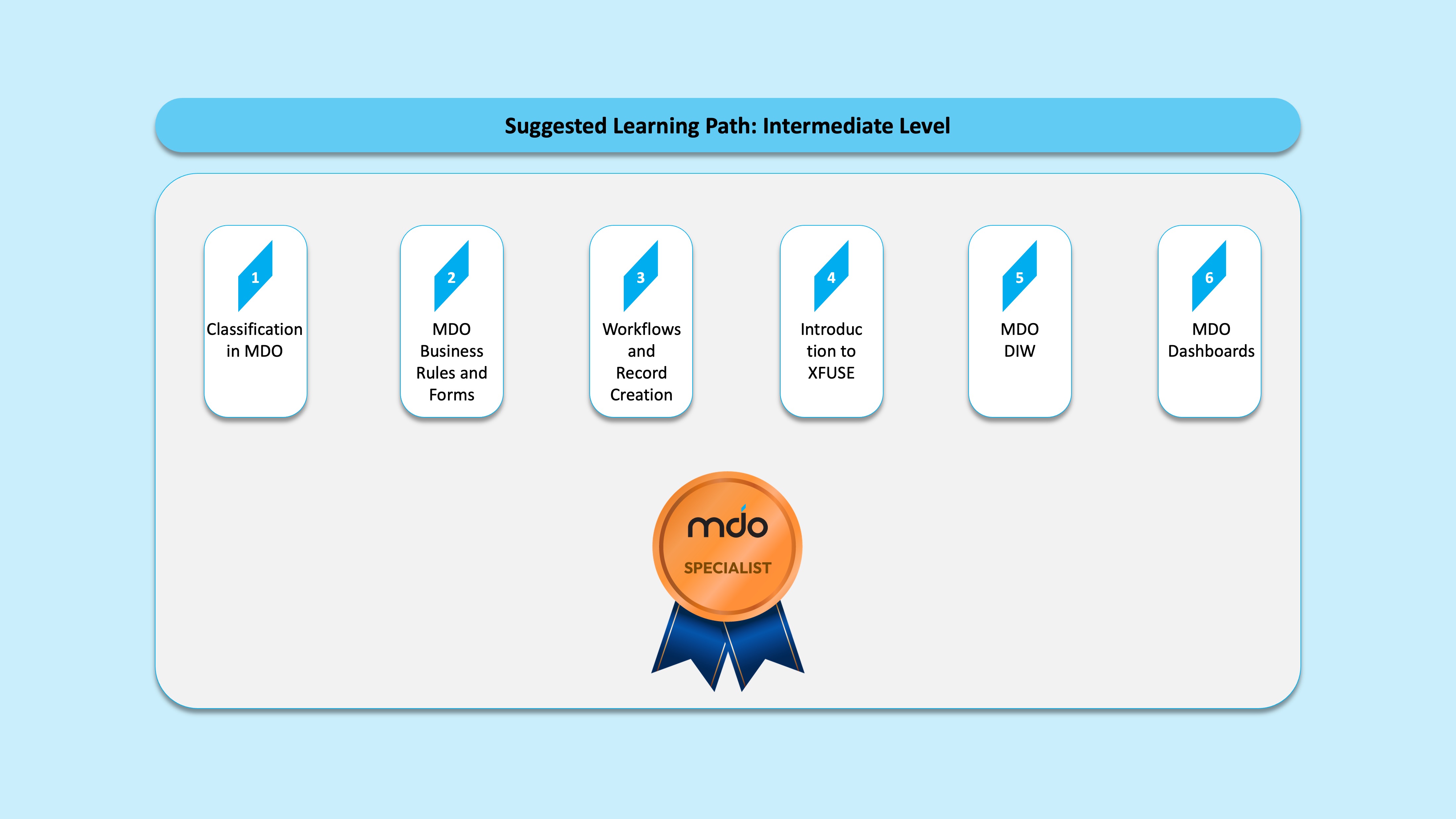 Expand your knowledge with practical courses on data classification, business rules, workflows, XFUSE, and dashboards. Prepare to apply MDO in real-world scenarios and move toward specialist-level expertise.
